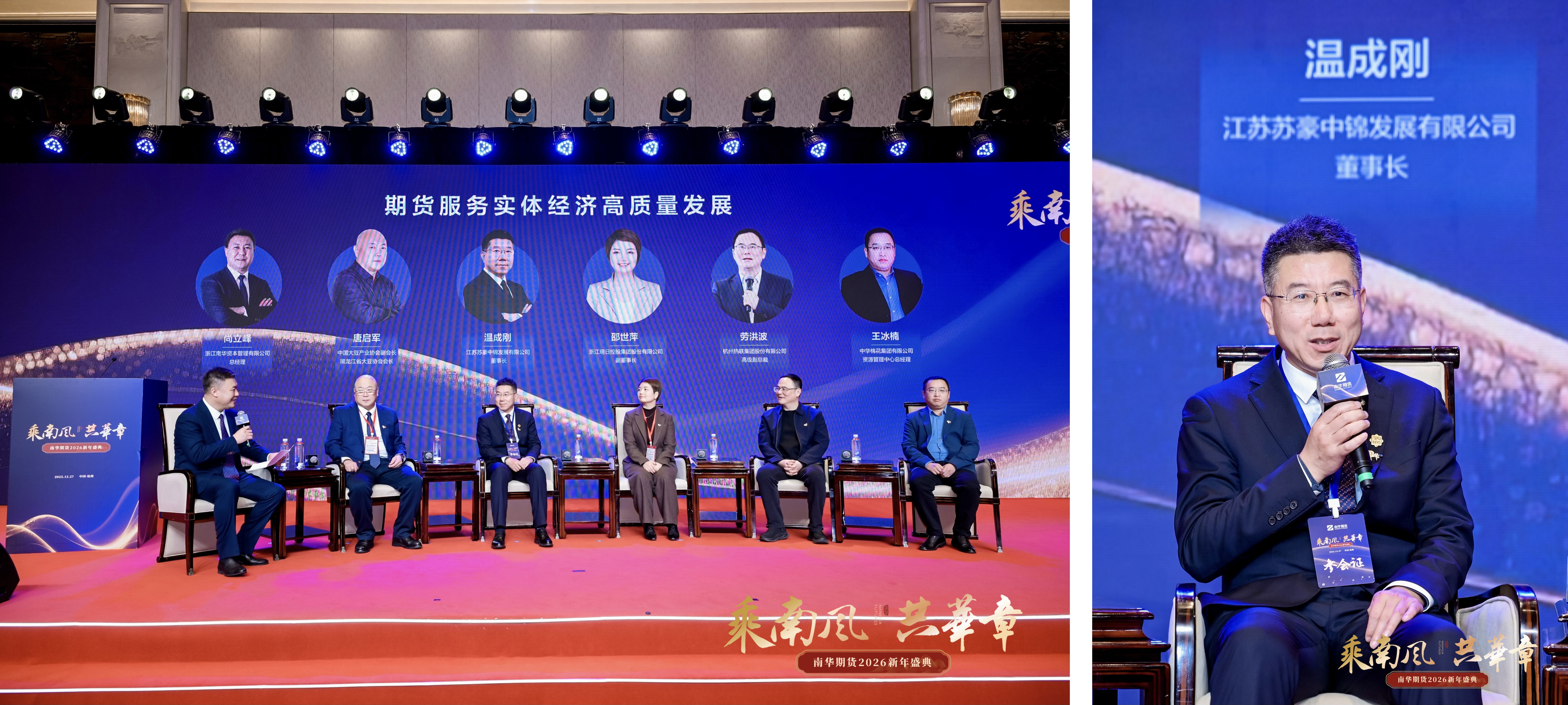 12月27日,“乘南風(fēng)·共華章——南華期貨2026新年盛典”在杭州隆重舉行。蘇豪中錦公司董事長(zhǎng)溫成剛應(yīng)邀出席,并作為產(chǎn)業(yè)代表參與“期貨服務(wù)實(shí)體經(jīng)濟(jì)高質(zhì)量發(fā)展”圓桌論壇。鴻協(xié)公司總經(jīng)理張若凡及業(yè)務(wù)骨干一同參加活動(dòng)。