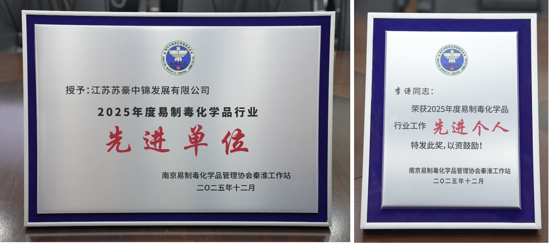 近日,在2025年度南京市秦淮區(qū)易制毒化學品單位總結表彰大會上,蘇豪中錦公司榮獲“2025年度易制毒化學品行業(yè)先進單位”稱號。公司員工李謙同時獲評“2025年度易制毒化學品行業(yè)工作先進個人”。