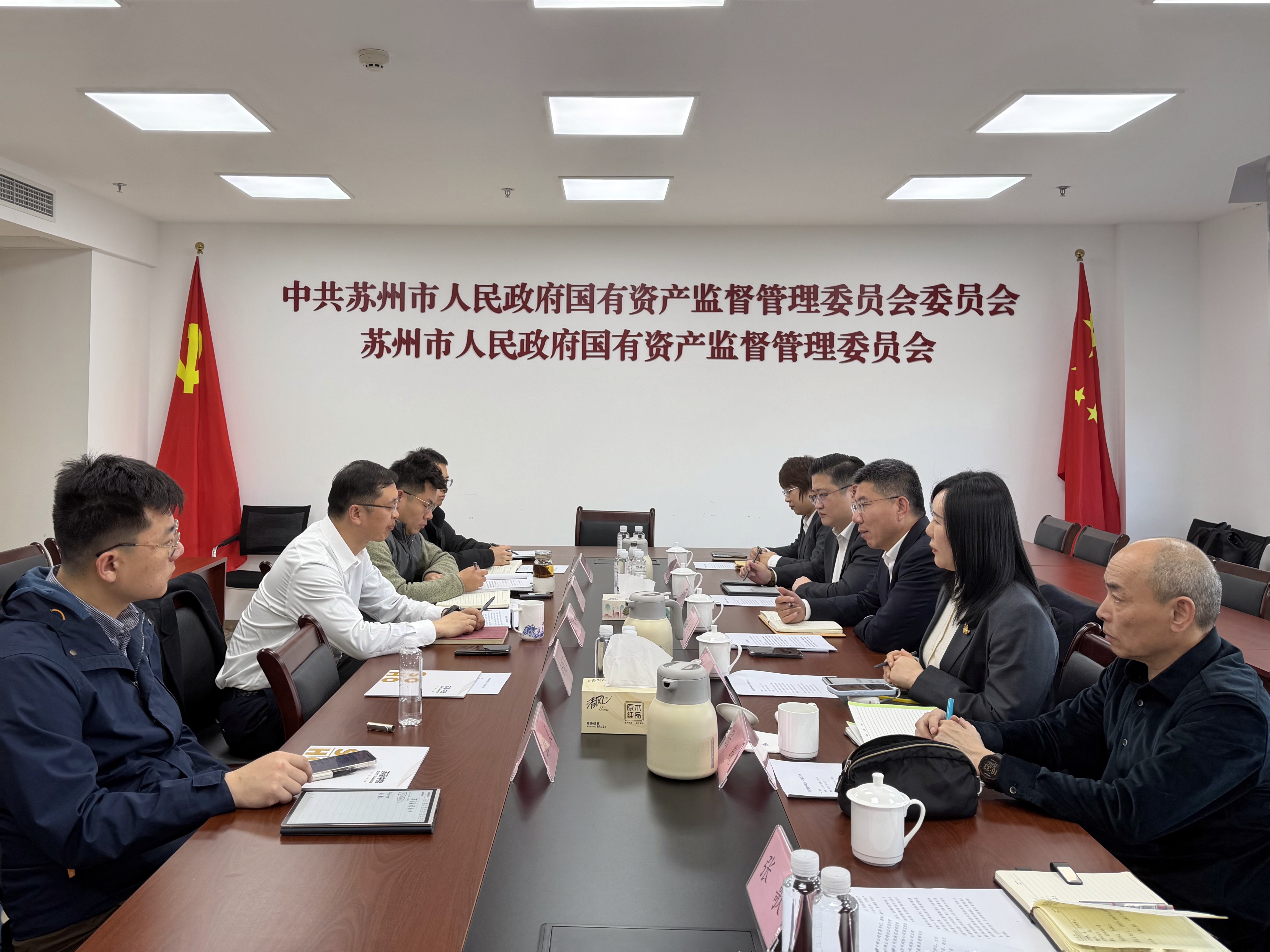 下午,溫成剛一行赴蘇州市國資委,與蘇州市國資委黨委書記、主任陳春明及相關(guān)領(lǐng)導(dǎo)進(jìn)行工作座談。溫成剛匯報了中錦公司發(fā)展歷程及業(yè)務(wù)布局,重點(diǎn)就業(yè)務(wù)監(jiān)管協(xié)同、市場化經(jīng)營節(jié)奏適配及戰(zhàn)略協(xié)同機(jī)制等議題聽取指導(dǎo)意見,并展開深入交流。