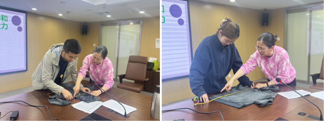 理論講解結(jié)束后,培訓(xùn)進(jìn)入現(xiàn)場實(shí)操環(huán)節(jié)。在葉明玉的一對一指導(dǎo)下,幾名業(yè)務(wù)助理按照標(biāo)準(zhǔn)流程完成技術(shù)包比對、尺寸測量、外觀縫制檢驗(yàn)等全流程操作。針對易錯(cuò)點(diǎn)和薄弱環(huán)節(jié),葉明玉現(xiàn)場糾錯(cuò)并示范正確手法,幫助大家快速將理論轉(zhuǎn)化為實(shí)操技能。